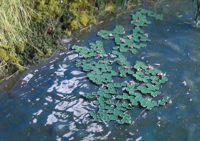 Jemně provedené listy a květyleknínů, které oživí vodní hladinu.
