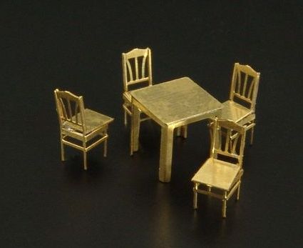 Stabnice židlí a stolu z leptaného plechu.